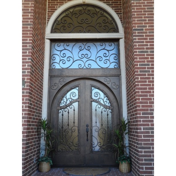 The styling on this double entry door is exquisite to begin with. After we added the custom iron design to the glass and complimented this with upper corner detail of the door frame, then literally topped it all off with a coordinated design to complete the rectangular and half round windows above the door. - Grandiose!!!