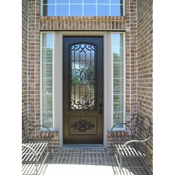 This is a beautiful door using privacy glass behind the artistic iron design and dressing up the lower solid panel with a centerpiece iron design.