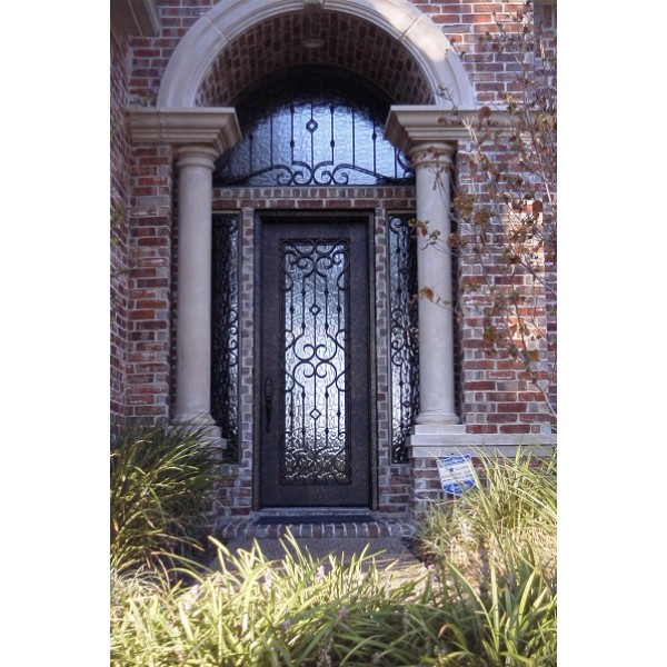 The beautiful arch and columns are the perfect frame for the intricate iron details on this front entry door, side lights, and upper window. Privacy glass was used on this entry to allow light into the home without compromising privacy and allowing the beauty of the ironwork to show through the glass without having to put window treatments up.