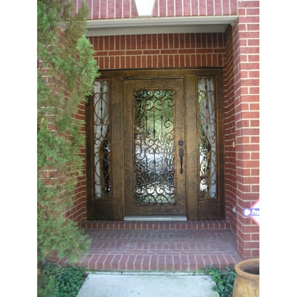 The scrolled ironwork we designed for the side lights and front entry door on this project added elegance and value to this home