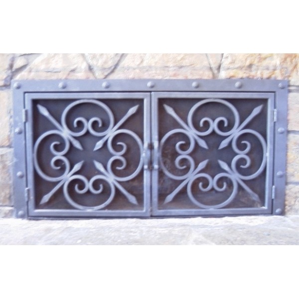 Double door fire place doors with identical rosette doors are framed with flat bar accentuated with hand forged rivets.