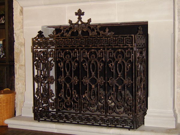 Heavily detailed cast iron tri-panel fireplace screen