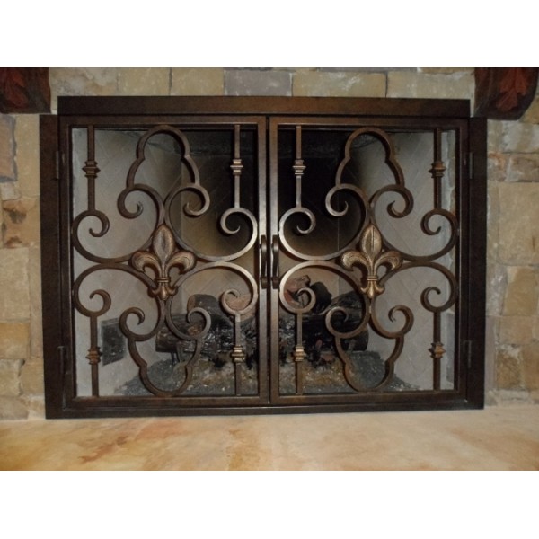 Fleur de Lis center medallion on each door with 4 square decorative collars on each door framing the beautiful design with a bronze finish.