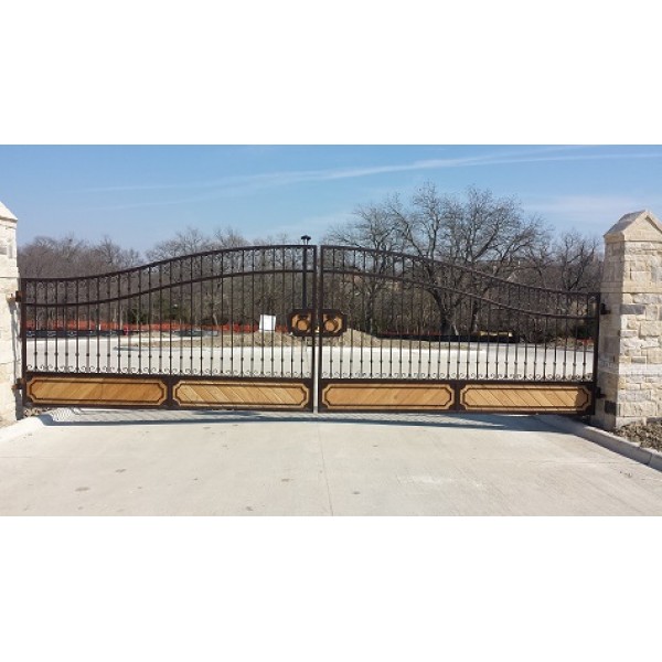 Extra large curved top double gate using wood inserts on the bottom panels and center latch to compliment any entrance with natural grace.